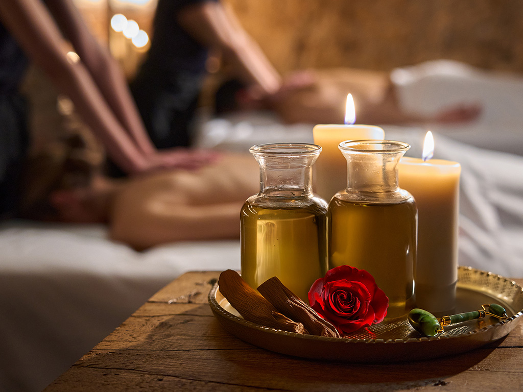Follow the candlelit path to the exclusive massage room for two where you will take guided aromatherapy inhalations with the scent of your choosing. Sandalwood is known for releasing stress and promoting the connection between two partners or rose which helps release endorphins and increase feelings of wellbeing.