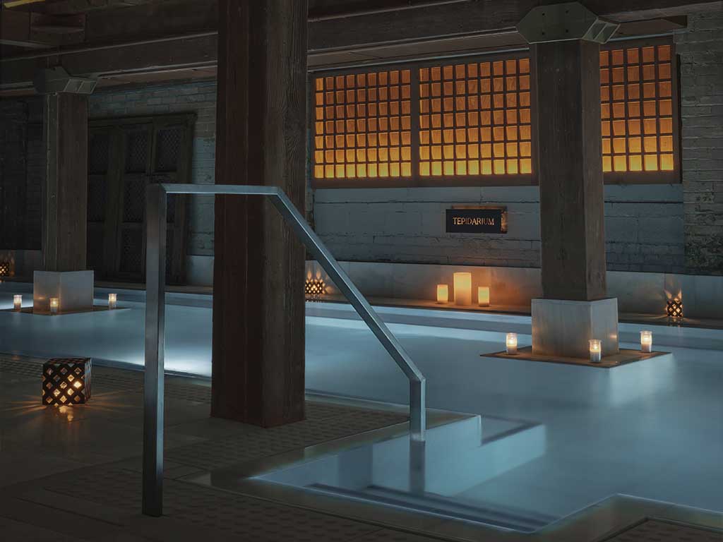 Walk together through our thermal baths at different temperatures: the Caldarium (Hot Bath), the Frigidarium (Cold Bath), the Tepidarium (Warm Bath), the Vaporium (Steam Room with Aromatherapy), the Saunarium, the Balneum (Two Baths of Thousand Jets) and the magnificent Palestra (Outdoor Bath), the Flotarium (Salt Bath) and a salt exfoliation area. Let water bring you peace and tranquillity.