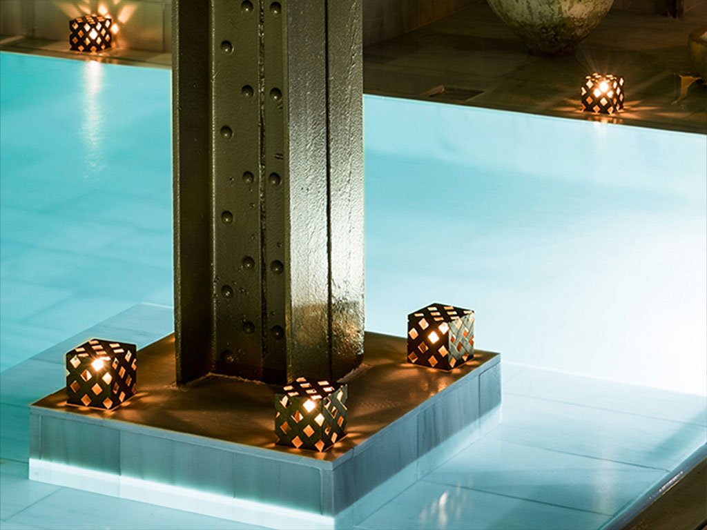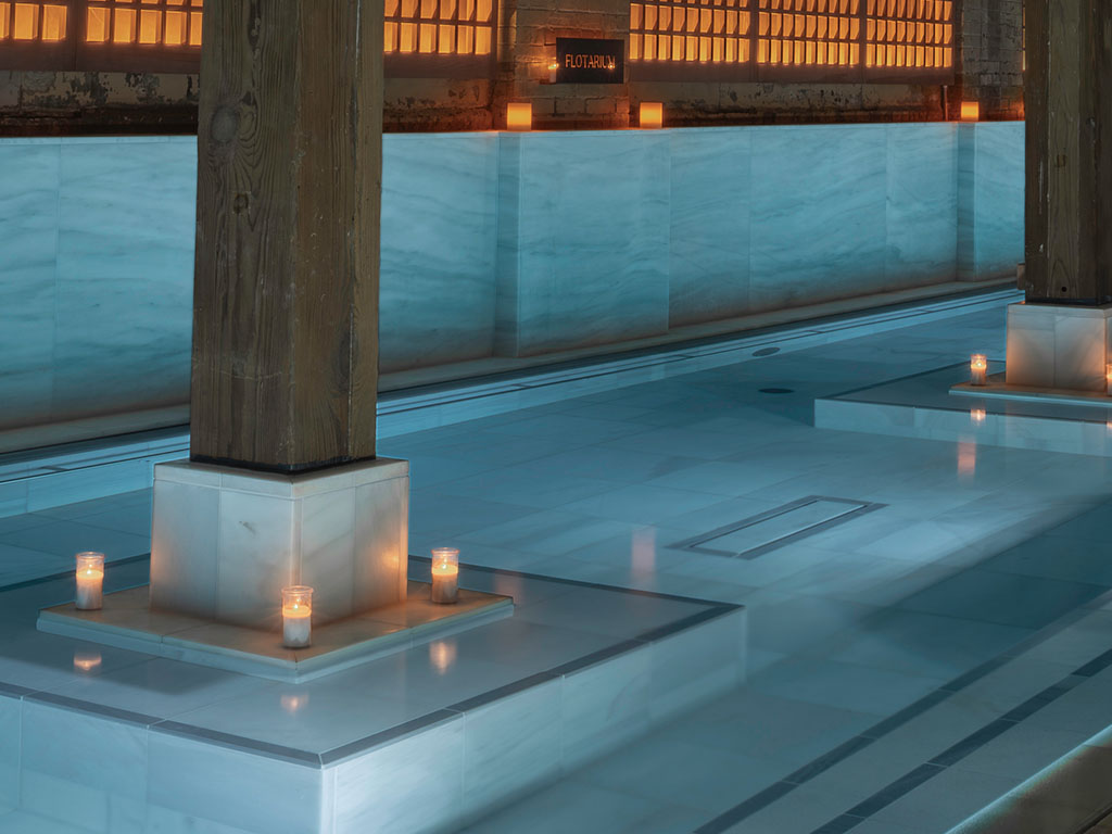 It includes our thermal baths at different temperatures: the Caldarium (Hot Bath), the Frigidarium (Cold Bath), the Tepidarium (Warm Bath), the Vaporium (Steam Room with Aromatherapy), the Saunarium, the Balneum (Two Baths of Thousand Jets) and the magnificent Palestra (Outdoor Bath), the Flotarium (Salt Bath) and a salt exfoliation area.